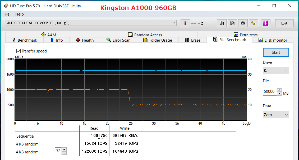 Kingston A1000 960GBにはTLCタイプの東芝製64層3D NANDメモリが採用されているので、多くのTLC型SSDと同様の特徴が大容量書き込み時にでており、今回検証した960GBモデルでは24GB程度のSLCキャッシュを超える書き込みアクセスでは書き込み速度が理想値1000MB/sから500MB/sまで低下します。