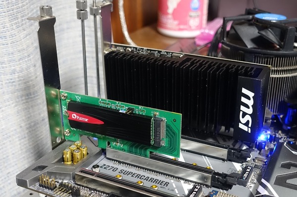 Plextor M9PeG 512GBのSSD温度の測定やサーマルスロットリング発生の有無の確認については、ヒートシンクがないPCIE-M.2アダプタ拡張ボードにSSDを装着して検証を行います、