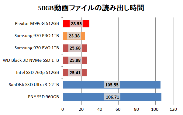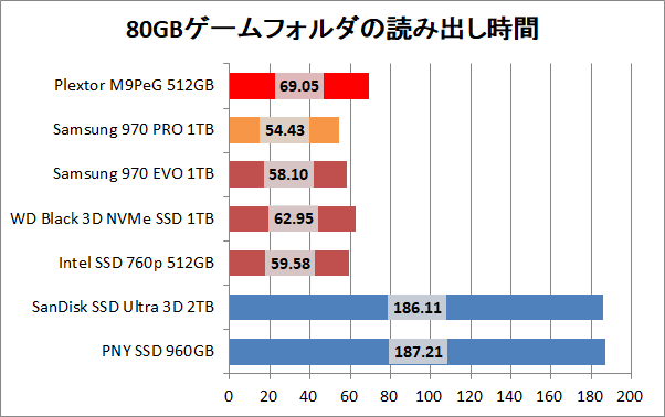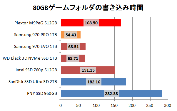 「Plextor M9PeG 512GB」など各種検証ストレージとSamsung SSD 970 PRO 1TBとの間で50GBの動画ファイルおよび80GBのゲームフォルダをコピーした時間の比較結果は次のようになりました。