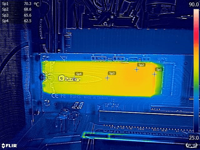 ヒートシンクを装着した状態ではヒートシンクの表面温度は70度前後になっているものの、おそらく内部のメモリコントローラーやメモリチップは上のヒートシンクなしの状態と同等の温度分布になっていると思います。