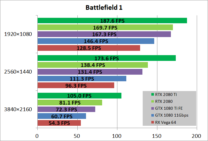 GeForce RTX 2080 Ti、GeForce RTX 2080、GeForce GTX 1080 Ti Founders Edition、GeForce GTX 1080 11Gbps OC、Radeon RX Vega 64 Limited Editionの4種類について実ゲーム性能の比率の平均を出したところ、GeForce RTX 2080 TiはGTX 1080 Ti FEよりも最大35%以上高速という結果になりました。RTX 2080 Tiはフレームレートが60FPS前後に近づいてCPUボトルネックが効きにくくなる4Kなどの高解像度においてGTX 1080 Tiよりも平均で35%程度高いパフォーマンスを発揮し、ゲームタイトルによっては40~50%も上回ります。