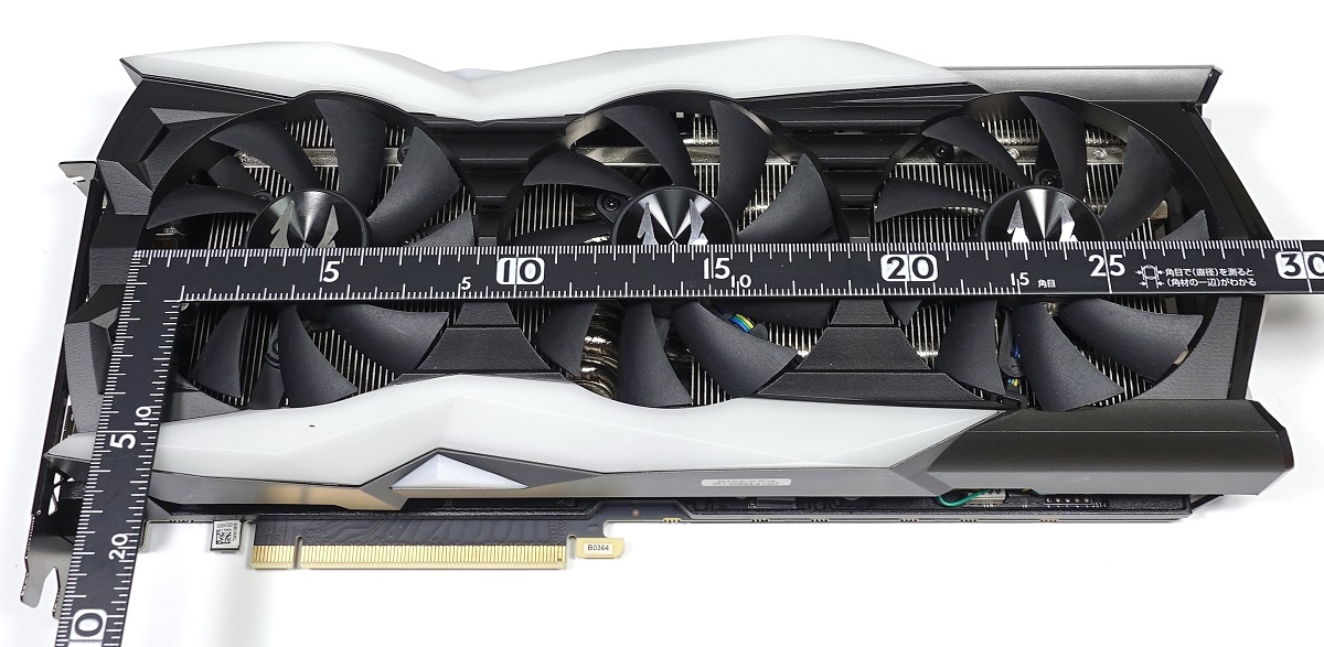 ZOTAC GAMING GeForce RTX 2080 AMP Extremeは、RTX 2080のリファレンスモデルともいえるFounders Editionの全長267mmよりも大幅に長い全長308mmとなっています。近年主流なオープンスペースタイプのPCケースなら干渉の心配はありませんが、PCケースフロントにストレージベイがある少し古めのPCケースではグラフィックボード設置スペースのクリアランスに注意が必要です。