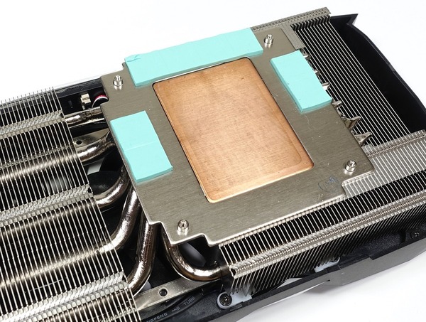 GPUクーラー本体をチェックすると、銅製ベースプレートから6本の8mm径ヒートパイプが伸び、放熱フィンの厚みも3スロットめいっぱいのサイズになっています。