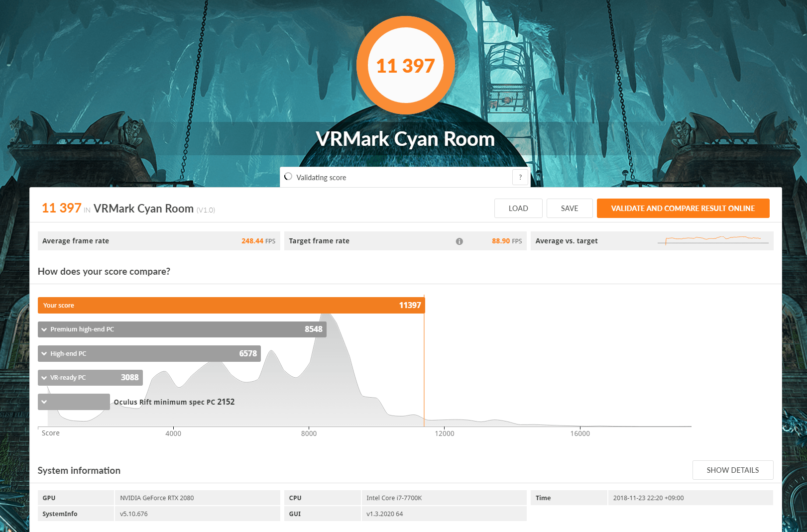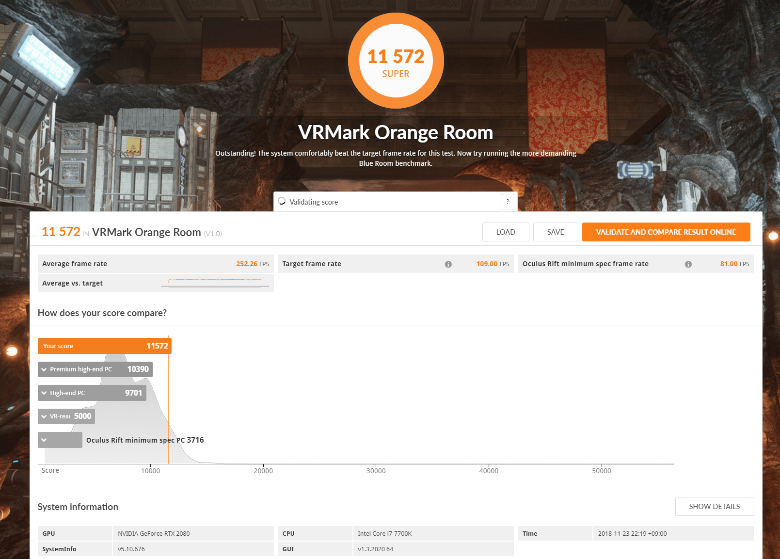「ZOTAC GAMING GeForce RTX 2080 AMP Extreme」を含めた各グラフィックボードについて、17年中頃から普及しつつあるHTC VIVEやOculus RiftなどVR HMDを使用したVRゲームに関する性能を測定する最新ベンチマーク「VRMark」による性能比較となります。