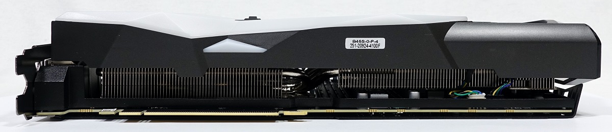 ベースプレートから伸びる6本の銅製ヒートパイプによって3スロットを占有する大型GPUクーラー内部いっぱいに展開された極厚なアルミ製放熱フィンの迫力も圧巻です。