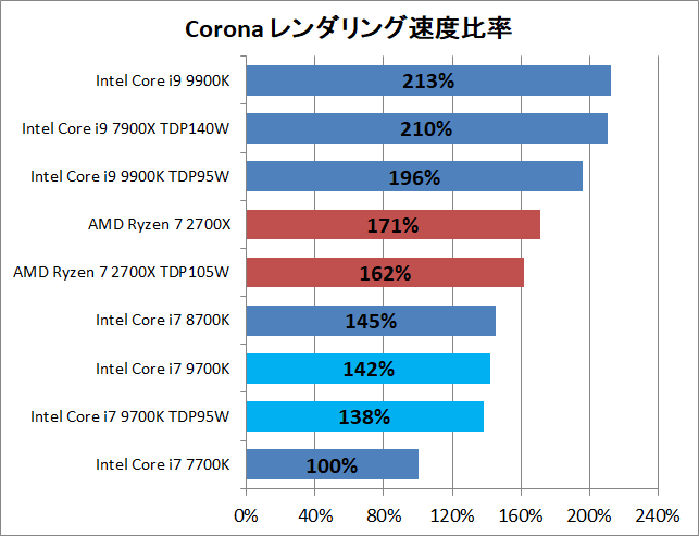 マルチスレッディング非対応で8コア8スレッドのCore i7 9700Kは、マルチスレッディング対応で8コア16スレッドのRyzen 7 2700Xに対して、クリエイティブタスクにおいて同等と評価しても問題ないくらい健闘していますが、現状では下位モデルのCore i5 9600KとRyzen 7 2700Xがほぼ同じ価格なので、クリエイティブ性能のコスパを考えるとRyzenに軍配が上がるかなと。