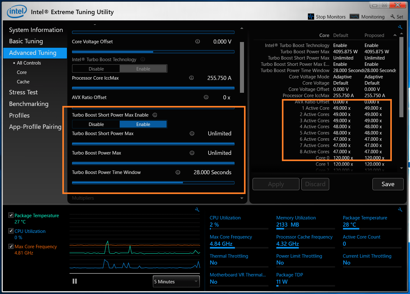 上の設定はASUS製マザーボードのBIOSメニューから設定した例ですが、ASRock、GIGABYTE、MSIなど主要4社のマザーボードであれば同種の設定項目が用意されているはずなので、同じように電力制限を課すことができます。再起動等で初期化されることもあるので、確実性の高いBIOSからの設定が推奨なのですが、「Intel Extreme Tuning Utility」からも設定が可能です。