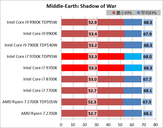 Middle-Earth: Shadow of War(4K解像度、ウルトラ-画質プリセット)に関する「Intel Core i7 9700K」を含めた各種CPUのベンチマーク結果は次のようになっています。 【全CPU比較データ】