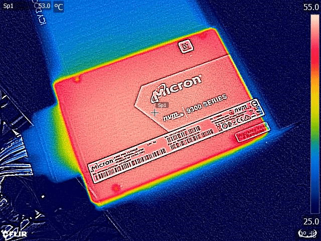 負荷テスト終盤における「Micron 9300 Pro 15.36TB」のSSD本体表面のサーモグラフィーは下のようになっています。「Micron 9300 Pro 15.36TB」のSSD表面温度は最大で53度程度でした。