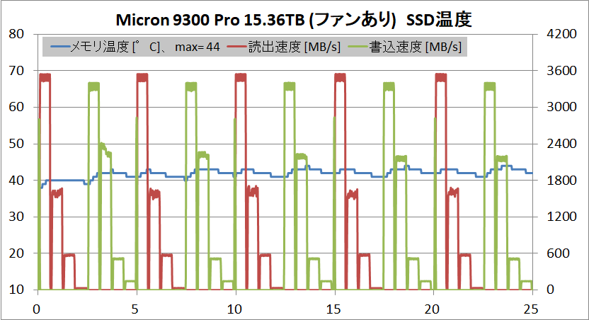 さらに「Micron 9300 Pro 15.36TB」へ92mm角ケースファンを1500RPMで回して風を当てた状態でも同様の測定を行ってみました。