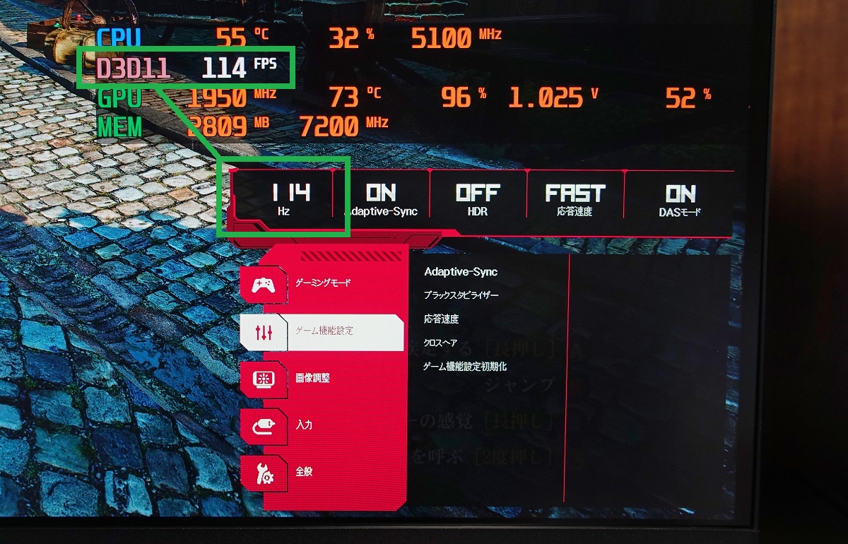 「AMD FreeSync (VESA Adaptive-Sync) / NVIDIA G-Sync Compatible」が正常に動作してリフレッシュレートが可変になると、「LG 27GL850-B」のOSDメニューから確認できるリフレッシュレートがフレームレートに合わせて変動するようになるので、機能が正しく動作しているかどうかはここを見て確認してください。