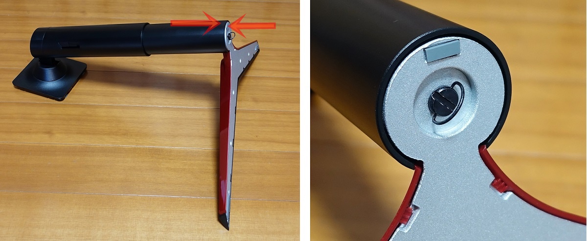 「Lumen MA-GS102BK」はモニタとアームを接続する部分がクイックリリースのブラケット式になっていてモニタアームからモニタ本体の着脱が非常に簡単です。ピボット機能もあるので設置後にモニタを縦・横で向きを切り替えることもできます。ただ関節の滑りに若干難があるので潤滑剤を塗布するのがおすすめです。