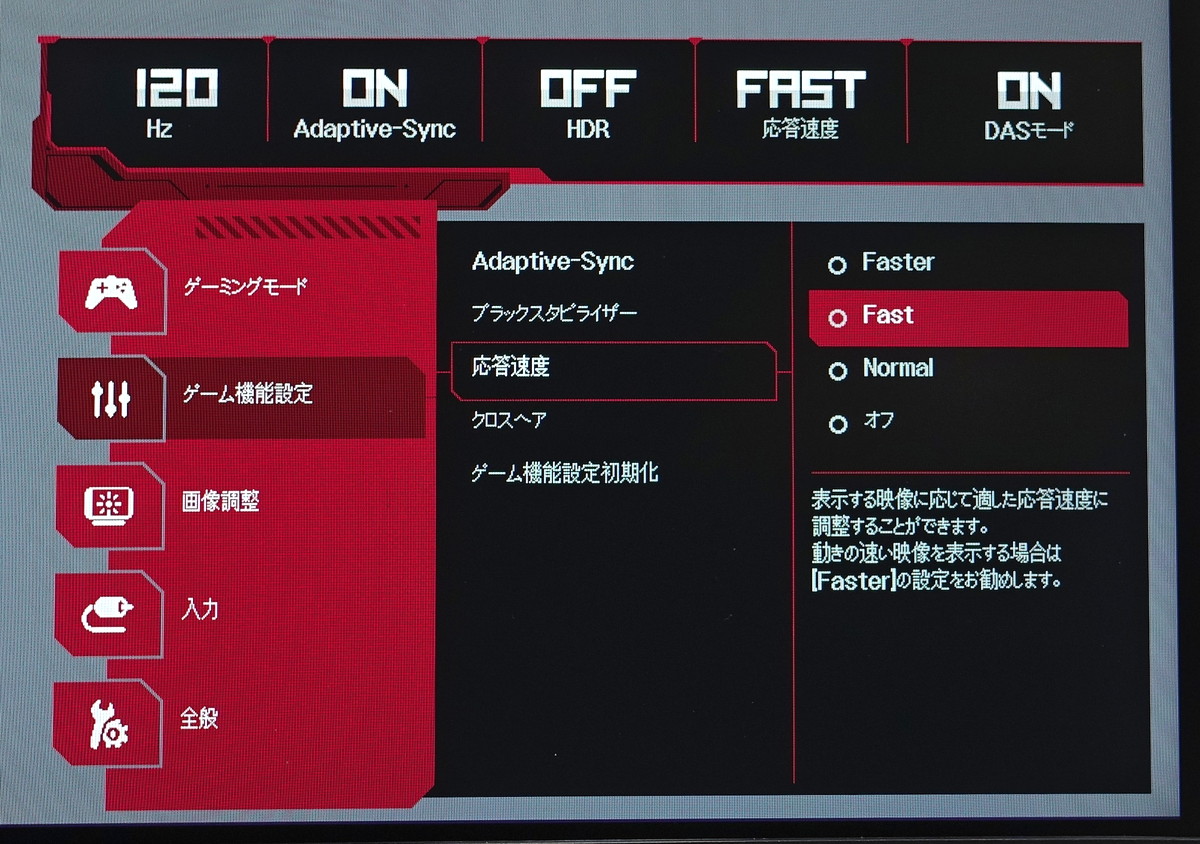 一般にオーバードライブと呼ばれる応答速度を調整する機能は、LG 27GL850-Bでは「応答速度」の名前で配置されています。オーバードライブ補正の強度をOff、Normal、Fast、Fasterの4段階で設定ができて、標準設定はFastになっています。