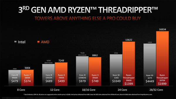 メインストリーム向けCPUと比較するとマルチスレッド性能に対するコストパフォーマンスはあまり高くありませんが、競合Intelの24コアや最大の28コアCPUが、エンタープライズ向けXeon製品に限られ3000~4000ドル以上もするのに対して、第3世代Ryzen Threadripperは2000ドル以下なので、24/32コアのCPUとしては破格のコストパフォーマンスと言っても過言ではありません。