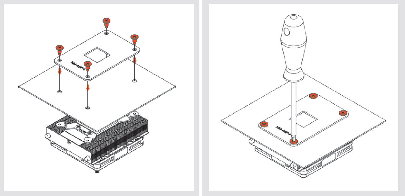 標準で搭載されているCPUクーラー固定器具を外してしまえば、「Noctua NH-L9a-AM4 chromax.black」の設置方法は、CPUクーラー本体を熱伝導グリスを塗布したCPUヒートスプレッダ上に合わせて、マザーボード背面からネジ止めする、という非常に単純な2ステップです。