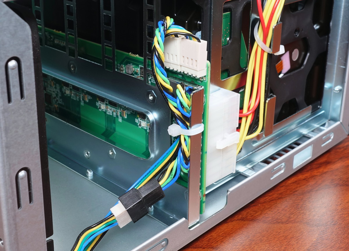 「QNAP TL-D800C / TL-D800S」は背面3か所のネジ止めを外し、外装パネルを後ろにスライドさせると、筐体内部にアクセスできます。ただし中には大したものはないので、上で説明したケーブルクリップの取り外しか、冷却ファンのメンテナンス・交換くらいでしか開くことはないと思います。