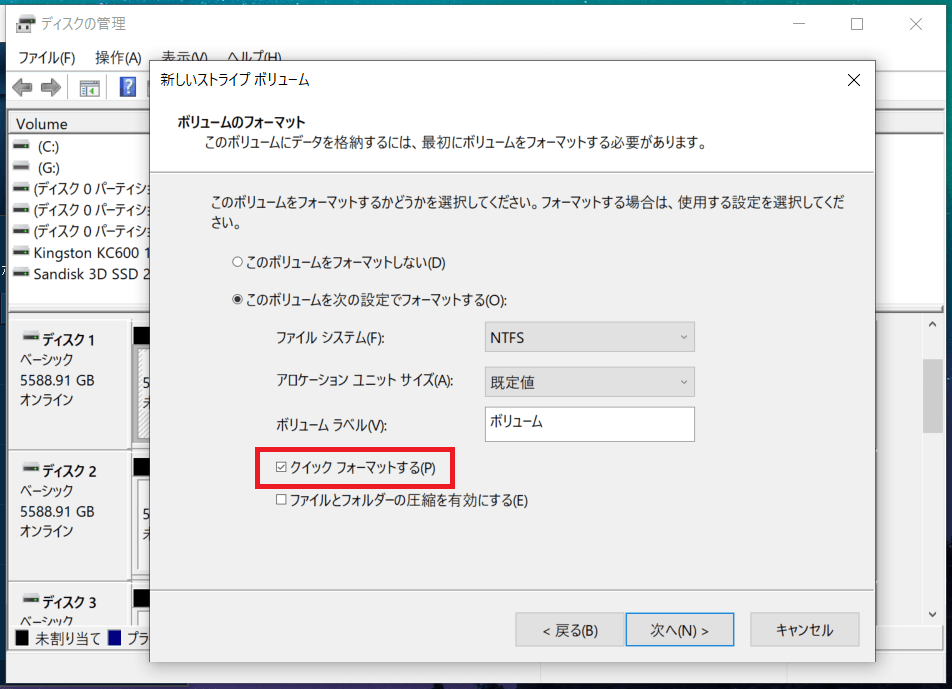 取り外しポリシーが「クイック取り外し」になっているとボリューム作成で最後にエラーが表示されます。またスパンボリュームやストライプボリューム(RAID0)に使用したストレージはPC電源がONの状態で着脱ができなくなります。