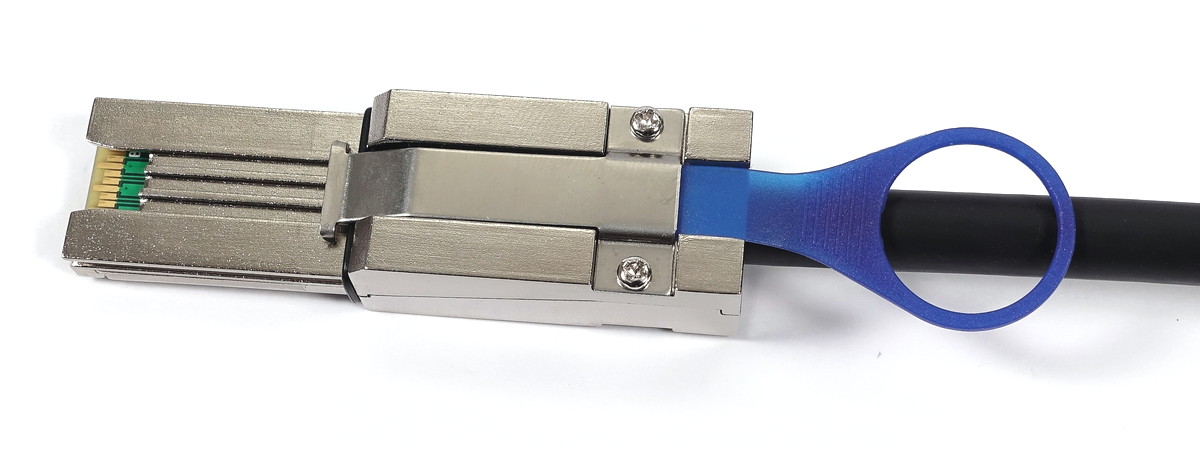 「QNAP TL-D800S」にはストレージエンクロージャーとPCを接続するためのMini SAS(SFF-8088)ケーブルもコネクタ数に合わせて2本付属しています。ケーブルのMini SAS(SFF-8088)コネクタは金属製でガッシリしており、抜き取り用の指掛けも付いていたりと、エンタープライズ向けを感じさせます。