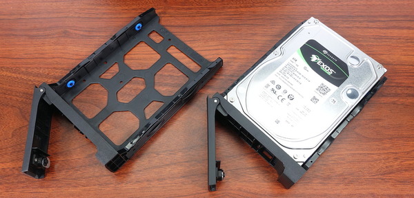 「QNAP TL-D800C / TL-D800S」のストレージトレイは下写真左側のような黒色プラスチック製の部品です。最大で3.5インチHDDを搭載でき、2.5インチサイズのHDDやSSDにも対応します。なおQNAP製NASと共通の汎用品なので破損しても保守部品として単品で入手できます。