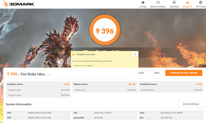 続いてOCした時のスコアになります。GTX1080 SLIと6950Xのリザルトがほぼないので、Physicsの差で総合スコアはかなり上位を狙えるかと思ったのですが、最大コアクロック2025程度ではUltraのスコアは10,000ちょっとまでしか上がりませんでした。現状で上位スコアは2.1GHz以上回るSLI環境が占めていてスコアは11,000ほどとなっています。2.1GHz以上はおそらく水冷or簡易水冷環境なんだと思います。加えて最大コアクロックは2025MHzでしたが実際は1940MHzとの間をうろうろしていたので、リファ空冷ではOCは厳しそう。