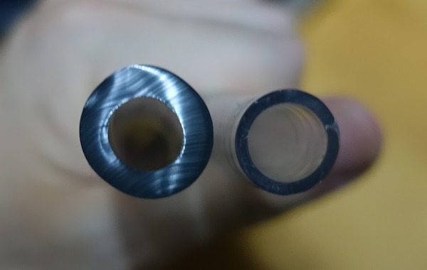 チューブの内径と外径はチューブの取り回しに直結します。加えてチューブ壁の厚さ(外径と内径の差)はチューブを曲げた時の折れ難さに影響してきます。例えば上で書いた「内径3/8インチ外径1/2インチ」と「内径3/8インチ外径5/8インチ」の2本のチューブの断面は次のようになっています。