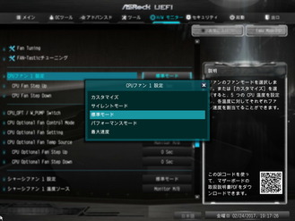 ASRock Z270 SuperCarrierのファンコン機能は設置されている5つのファン端子を個別に「標準/サイレント/パフォーマンス/最大速度」の4種類のプリセット設定に加えて、個別に温度・ファン速度の比例グラフを指定できる「カスタマイズ」の5つのモードを使用できます。