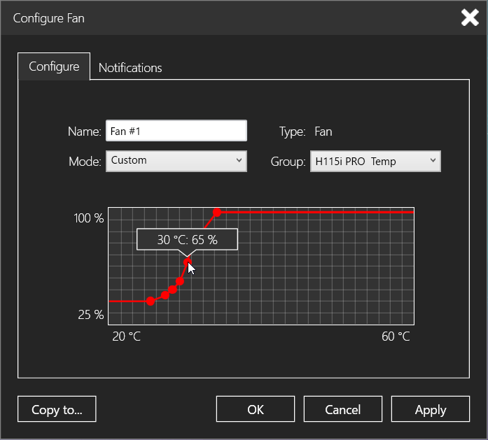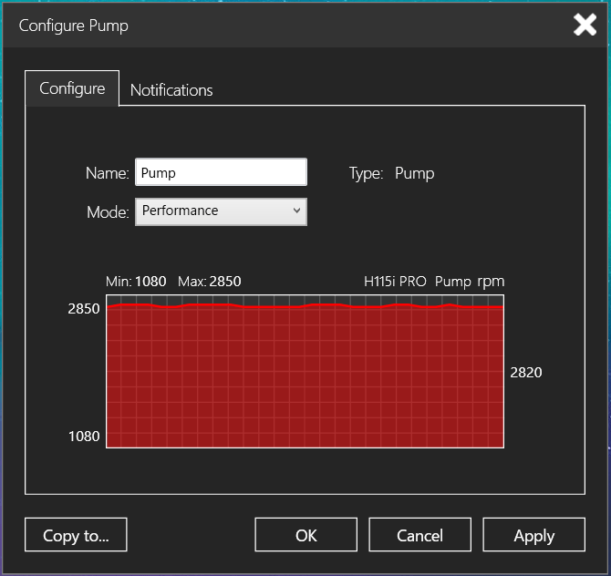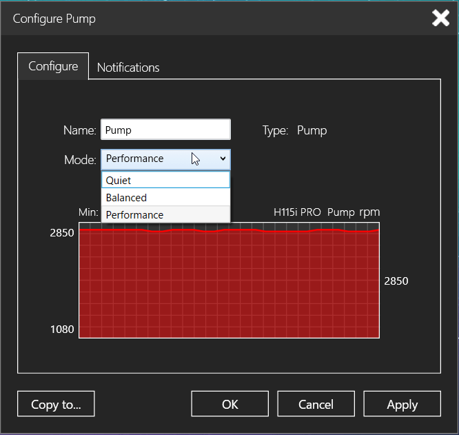 Corsair H115i PRO RGBに接続された2基のファンはタイル状の各モニタリング値を選択することで上記のウィンドウを表示して個別に設定できますが、設定ウィンドウ左下の「Copy to…」ボタンを使用することで、現在選択しているファンの制御設定をその他の2つのファンに適用して一括設定することが可能です。