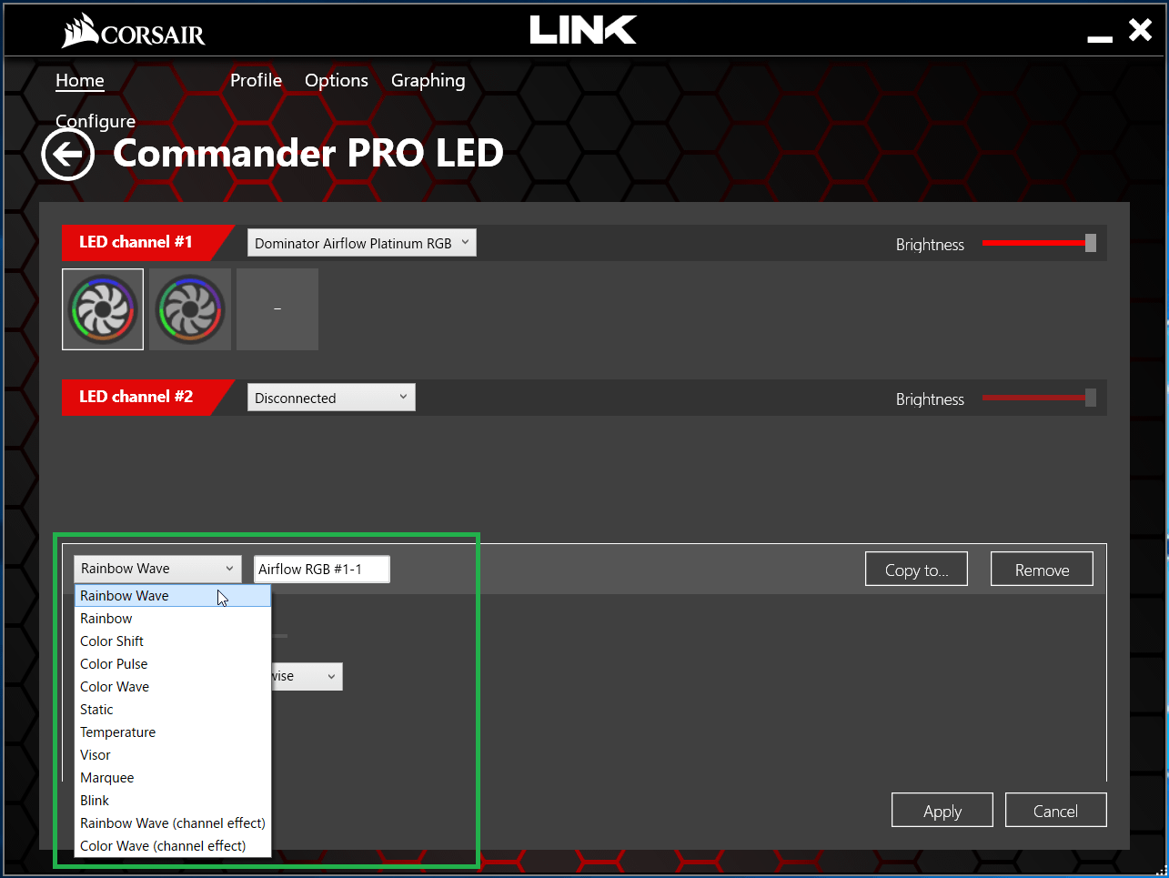 LED Channelに「Corsair Dominator Platinum Airflow RGB」のプレビューイラストが表示されたら、下側のプルダウンメニューから各種発光パターンが選択できます。