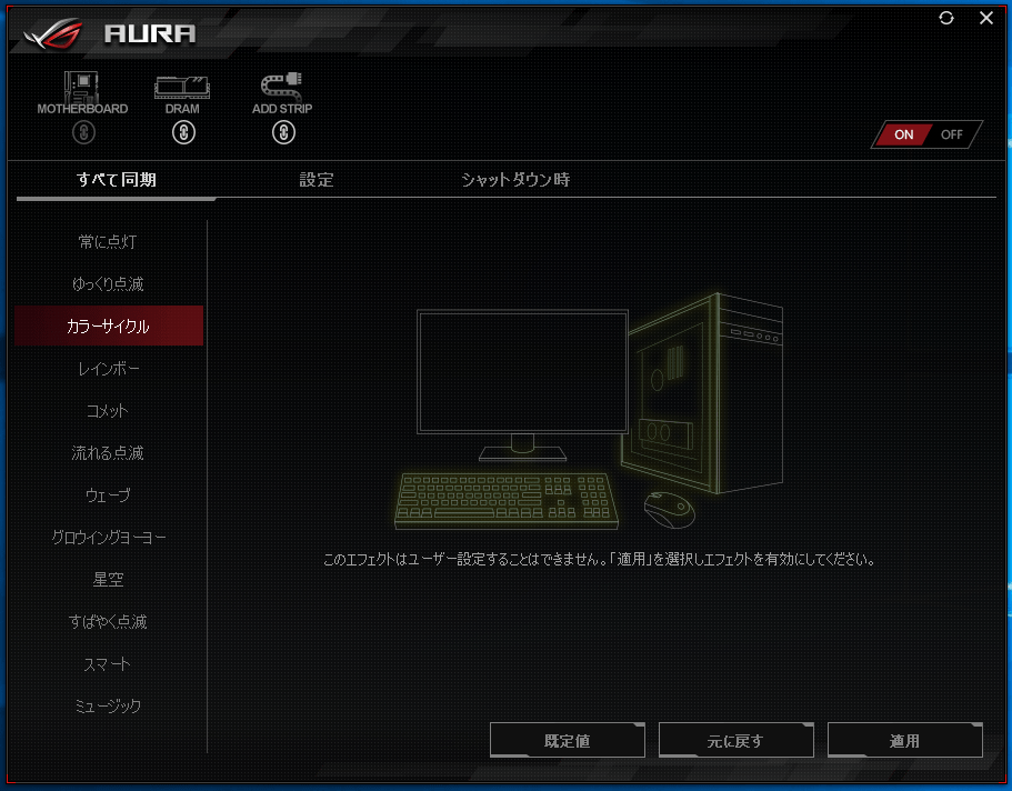 「カラーサイクル」ではメモリのLEDイルミネーションが同期して特定の発光カラーで点灯しながら緩やかに別の発光カラーへと遷移していきます。