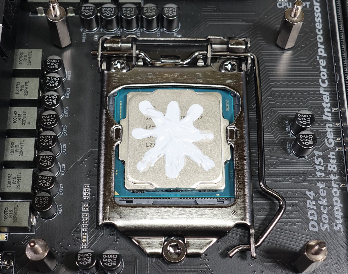 グリスを塗る量はてきとうでOKです。管理人はヘラとかも使わず中央山盛りで対角線だけ若干伸ばして塗っています。Thermal Grizzly Kryonautは柔らかいグリスで適量が塗布されていれば、CPUクーラー固定時の圧着でヒートスプレッダ全体へ自然に伸びるので塗り方を気にする必要もありません。
