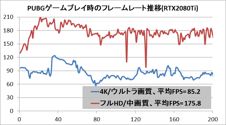 PUBGについてはゲーム内ベンチマークがないのでトレーニングモードで可能な限り他プレイヤーの影響を受けないように注意して測定しています。そのためPUBGベンチマークのフレームレートはRTX 2080 Tiで通常プレイを行った場合より高めです。(RTX 2080 TiでPUBGのプレイした時のフレームレート)