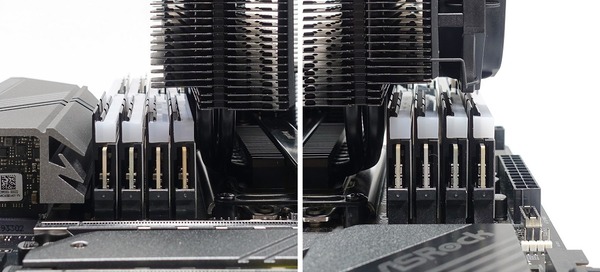 これらのマザーボードにおける「be quiet! Dark Rock Pro TR4」のメモリクリアランスについては4枚刺し、および8枚刺しのどちらであってもCPUソケットに最も近い左右2スロットにヒートシンクが被さります。
