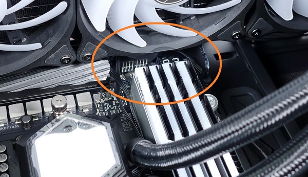 もう1つの注意点ですがマニュアルで図解されている通り、全高36mm以上の背の高いヒートシンクが装着されたDDR4メモリはファンやラジエーターと干渉する可能性があります。