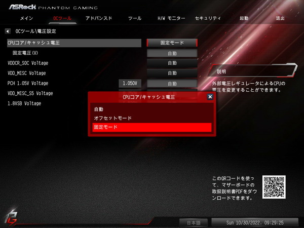 もう1点、メモリOCプロファイルを適用すると「ASRock B650MPG Riptide WiFi」の自動設定ではSOC電圧が1.250Vに設定されます。