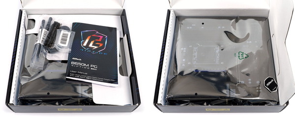 「ASRock B650M PG Riptide WiFi」のパッケージは上に取っ手のついたキャラメル箱の外スリーブと2層の内パッケージという構造で、上段にはマザーボード本体が、蓋付きの下段には各種付属品が収められています。