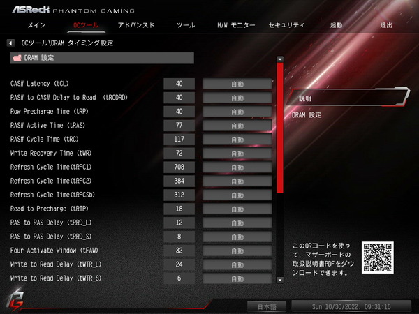 「ASRock B650M PG Riptide WiFi」ではメモリタイミングの個別手動設定も可能です。