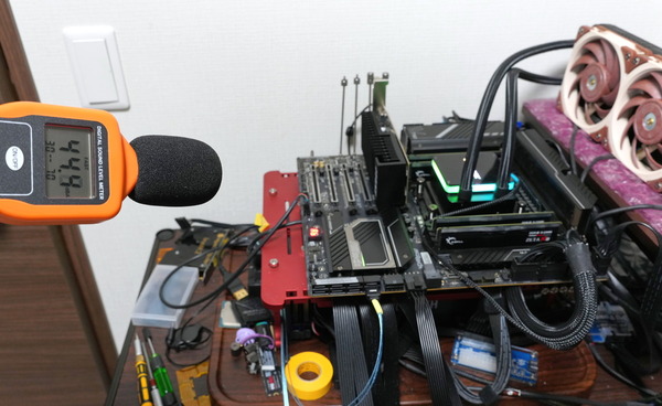 定格の3500RPM程度ならファンノイズはほとんど気にならないのですが、450W負荷時のように5000RPMを超えると、50cm程度の距離でノイズレベルを測定して45dB程度となっており、PCケースに組み込んでも高周波ノイズが耳障り聞こえる感じでした。