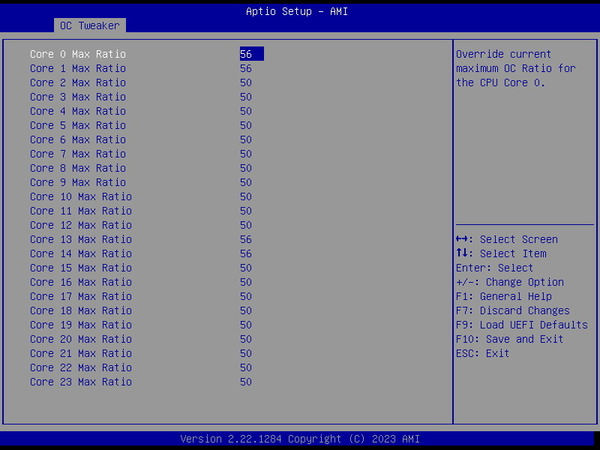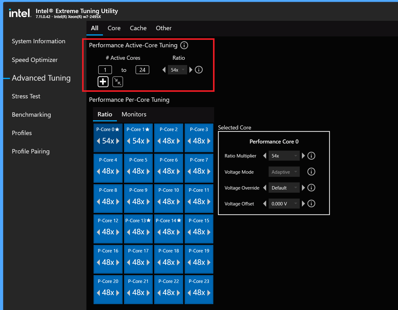 オフセット電圧を使用しているのでマルチスレッド負荷時の性能が若干下がっていたり、単コアブーストを伸ばしきれていないのですが、ひとまず、24コア48スレッドのXeon w7-2495Xでも単コア5.4GHz、インゲームCore All 5.0GHzくらいならOCに成功しています。