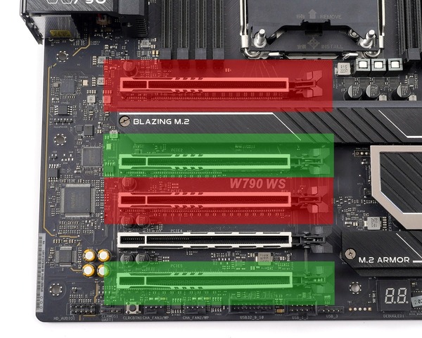 「ASRock W790 WS」の最上段のPCIEスロットは自作PC用マザーボードとして一般的な2段目ですが、CPUソケット自体が下寄りな配置もあって、大型の空冷CPUクーラーを組み合わせると、ヒートシンク・ファンが最上段に設置したPCIE拡張カードと干渉する可能性があります。