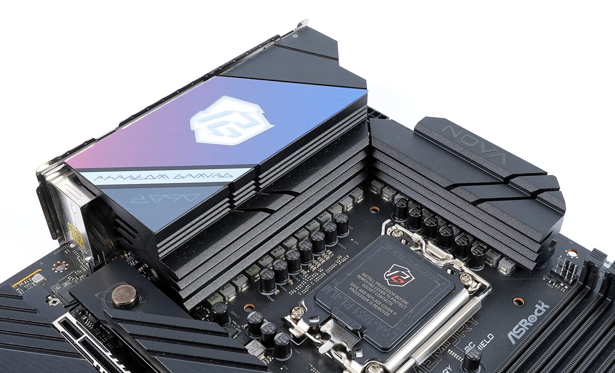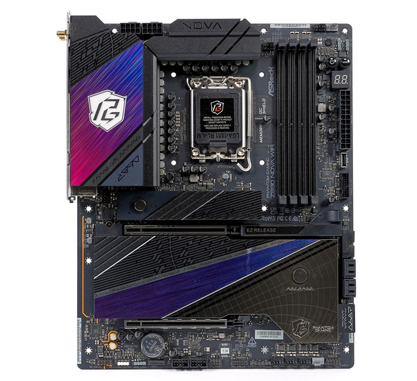 青色から紫色のグラデーションでホログラム的に輝く斜めラインの装飾は、製品名でもあるNovaらしく、ゲーミングマザーボードとしてカッコよく仕上がっています。