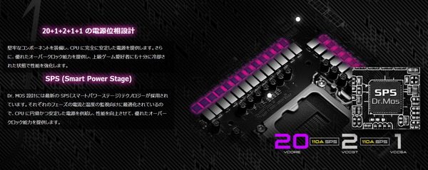 その他にも、従来比2倍の静電容量 1000uFで高負荷かつ大きな変動に対してより安定した出力電流を維持でき、20,000時間の寿命でより優れた安定性と信頼性を提供する20K ブラックコンデンサ、飽和電流を最大3倍まで効果的に増加させるためマザーボードのVcore電圧を強化する新世代プレミアム60Aパワーチョークコイルなどで堅牢なVRM電源回路が構築されています。
