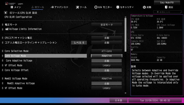 同メモリに収録されたOCプロファイルを適用するだけで、メモリ周波数 8400MHz、メモリタイミング 36-46-46-115が安定動作しました。メモリコントローラー周波数UCLKも1:2同期です。