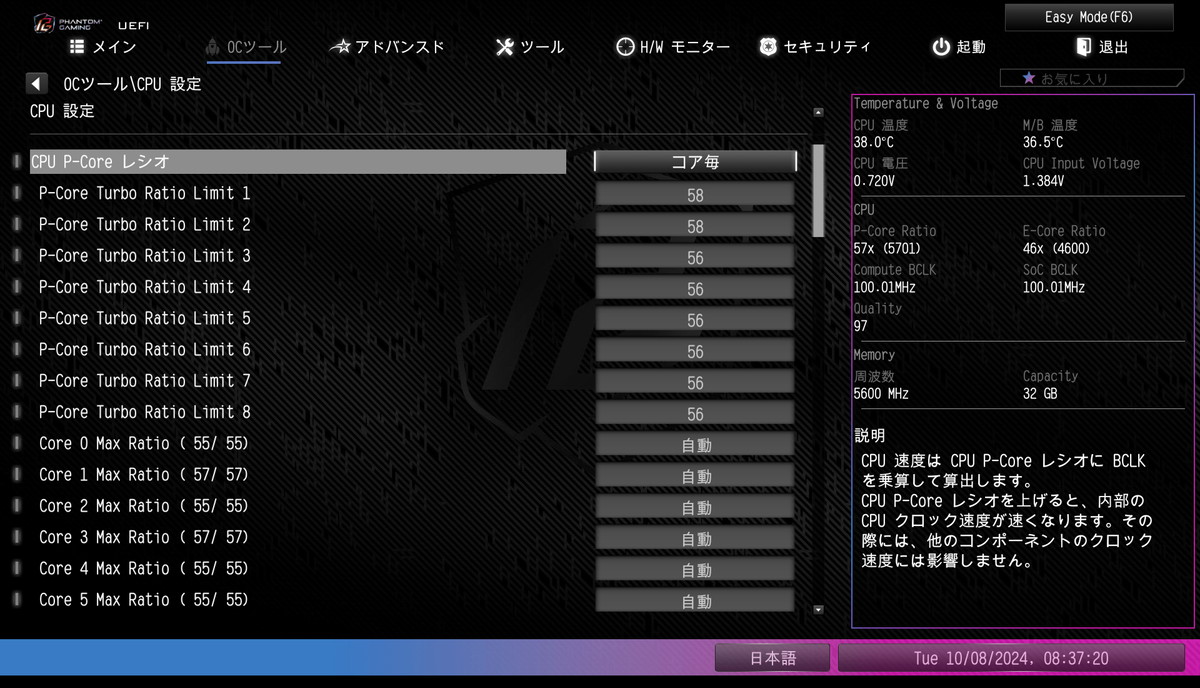 市販クーラーで冷却性能が最高クラスの360サイズAIO水冷でもCore Ultra 9 285KはCPU温度的に定格PL:250Wよりも電力を増やすのが難しく、OCの伸びしろはそれほど大きくありませんし、これで十分です。