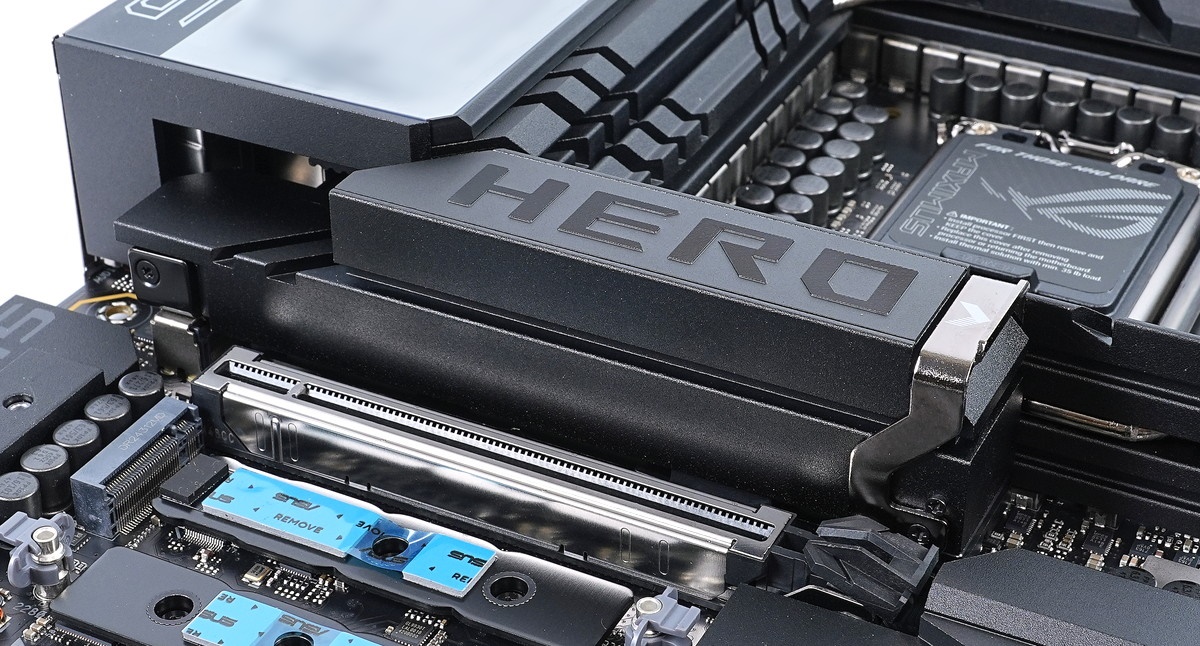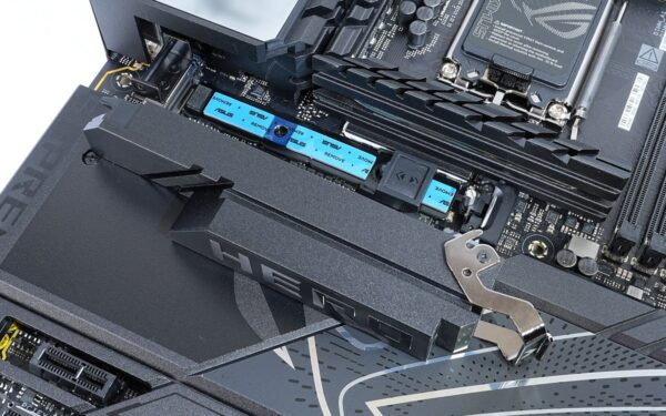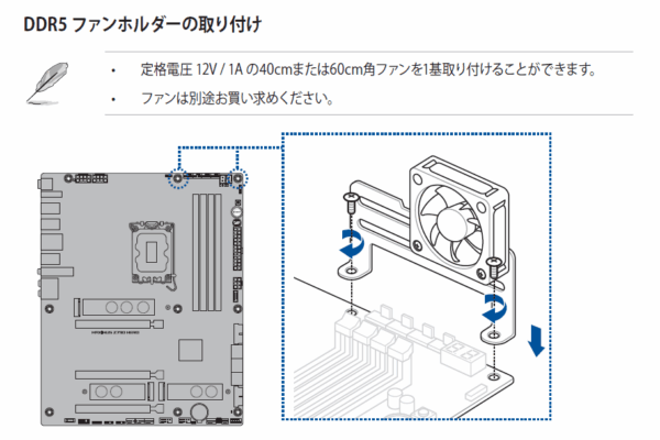 「ASUS ROG MAXIMUS Z890 HERO」にはシステムメモリの冷却を補助するため最大60mm角ファンを増設できるDDR5ファンホルダーが付属しています。