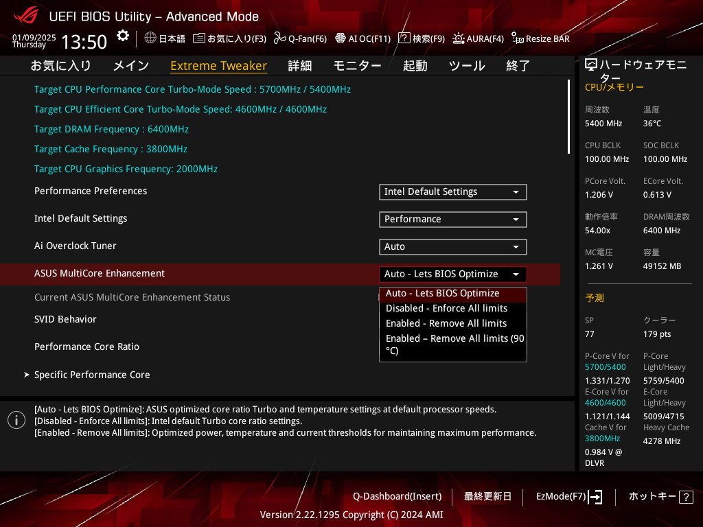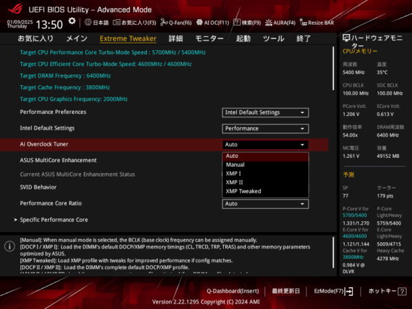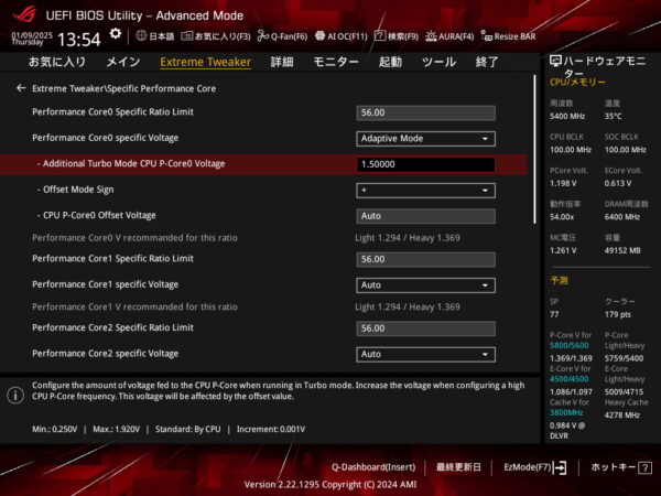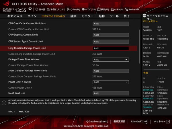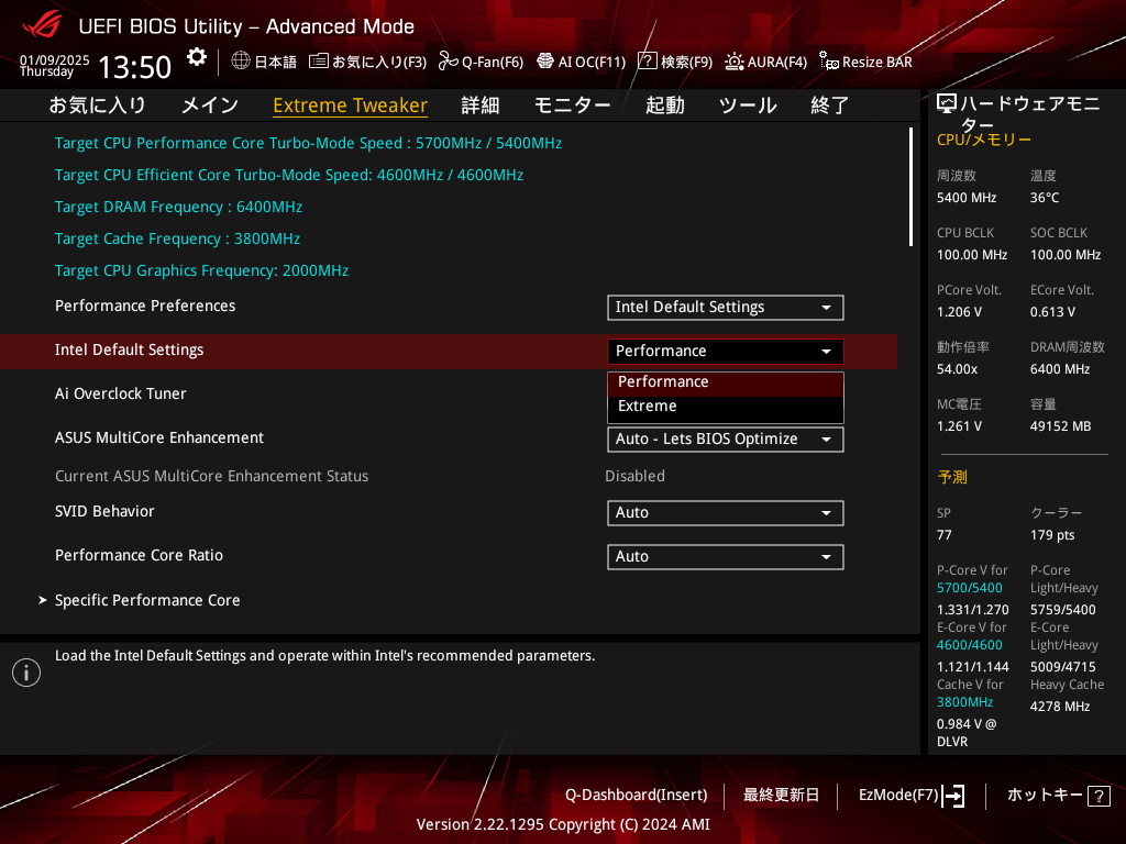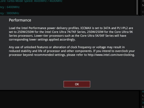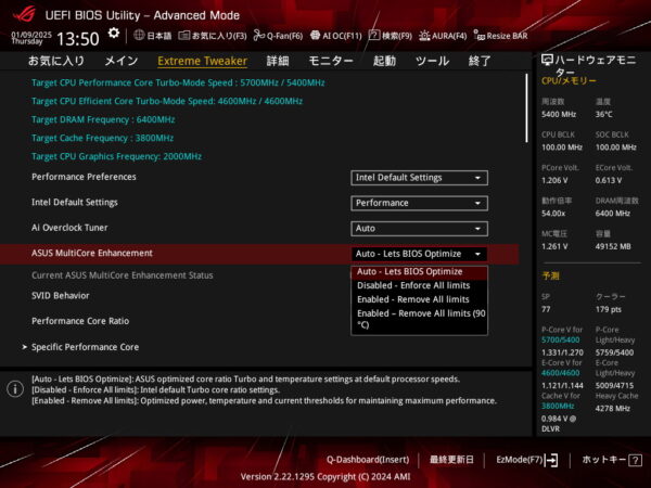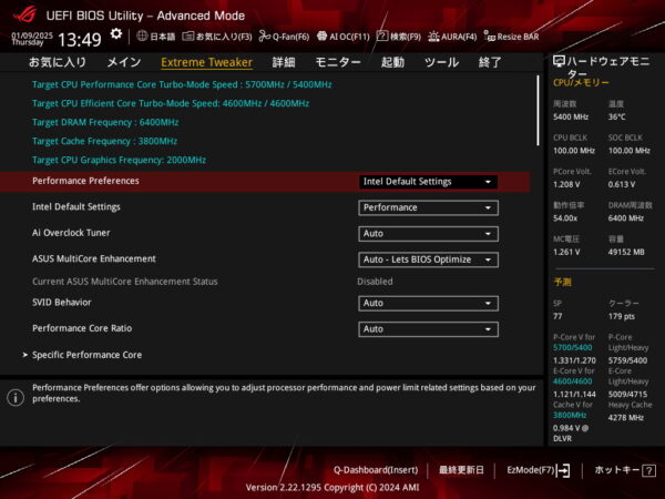 Intel Core Ultra 9 285Kは250Wの電力制限の時点でCPU温度的に伸びしろがほとんどないので、単純に「ASUS ROG MAXIMUS Z890 HERO」でIntel Default SettingsをPerformanceとして定格で動作させました。