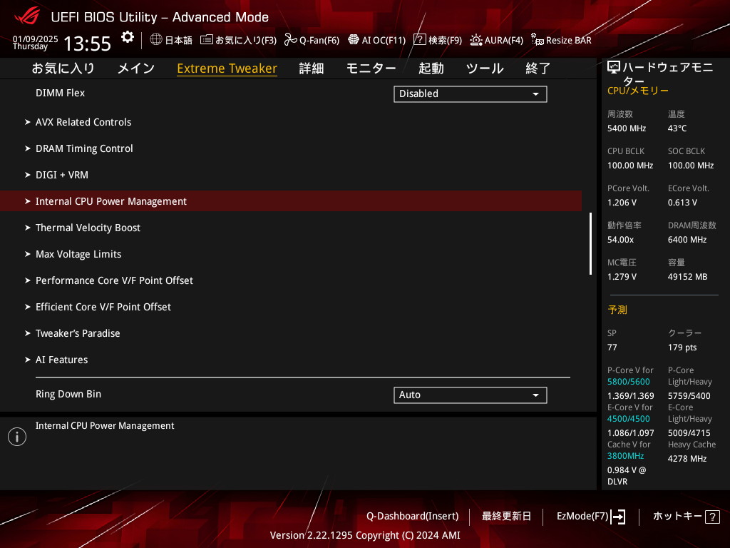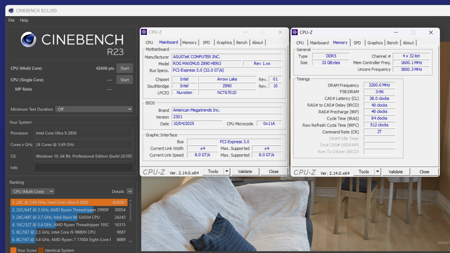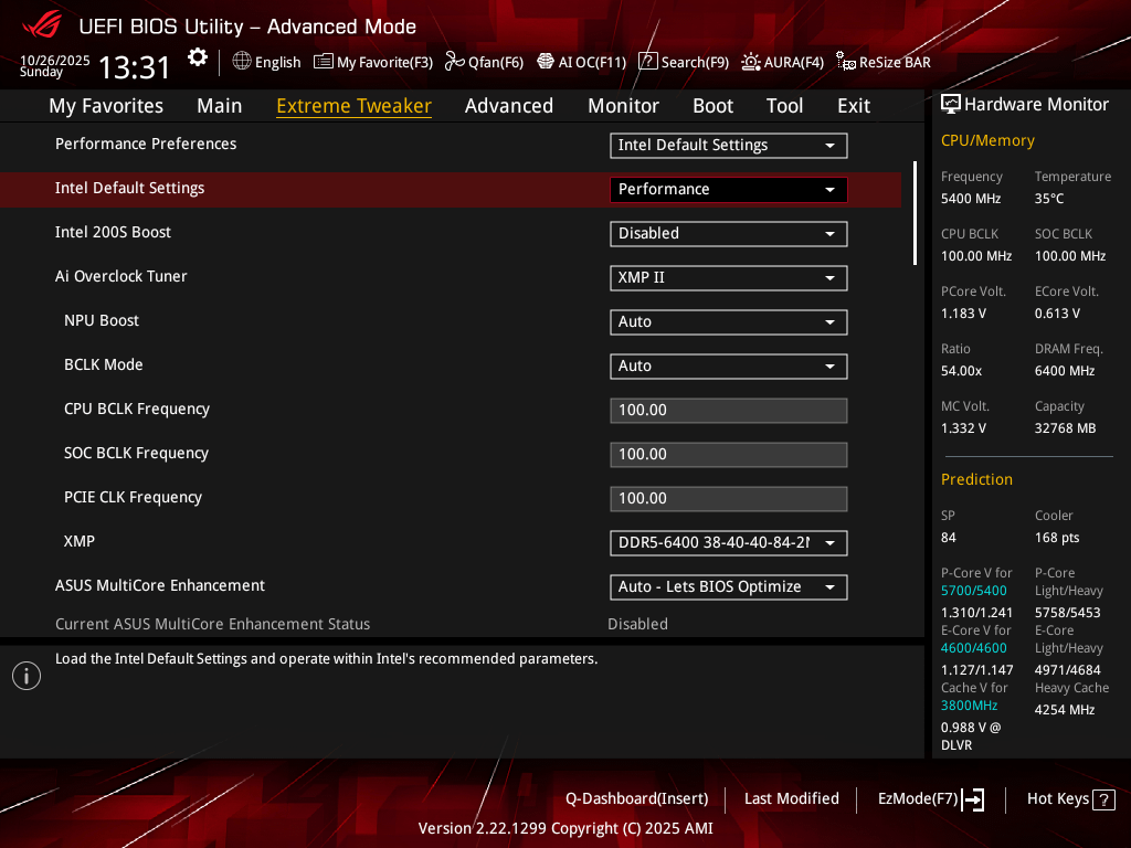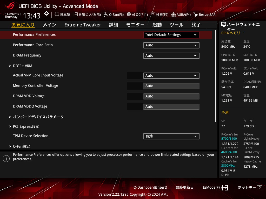Intel Core Ultra 9 285Kは250Wの電力制限の時点でCPU温度的に伸びしろがほとんどないので、単純に「ASUS ROG MAXIMUS Z890 HERO」でIntel Default SettingsをPerformanceとして定格で動作させました。
