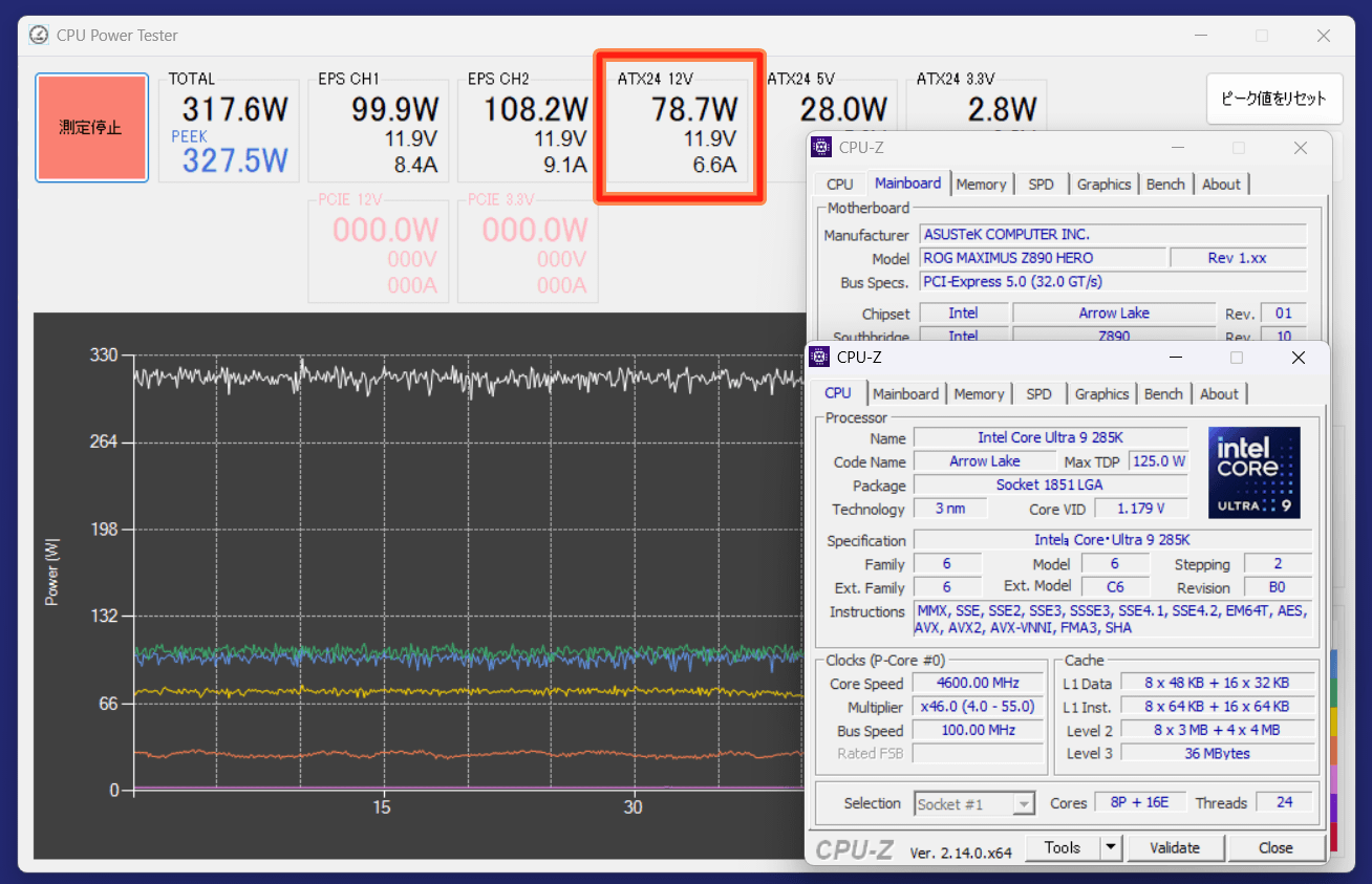 通常、CPU消費電力の大半はEPS電源端子からの供給で賄われますが、「ASUS ROG MAXIMUS Z890 HERO」は負荷分散のため、その一部(50~60W程度)をATX 24PIN経由で供給しているようです。
