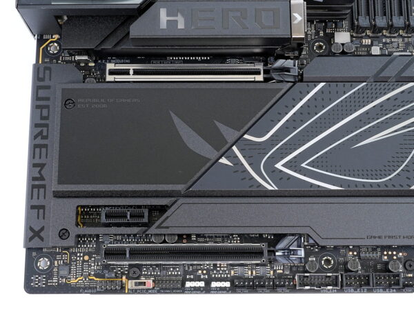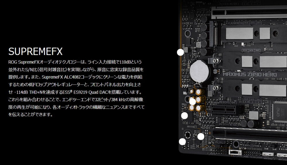 「ASUS ROG MAXIMUS Z890 HERO」は、最大24コアのCore Ultra 9にも対応できる110A対応SPSで構成された27フェーズVRM電源回路を搭載することに始まり、リアIOに覆い被さる超巨大VRM電源クーラー、PCIE5.0対応を含む6基のNVMe SSD用M.2スロット、2基のThunderbolt 4対応USB Type-Cポート、高速な5.0GbイーサやWi-Fi 7対応無線LANなど次世代高速NIC、ALC4082&ESS製DACによるハイレゾ対応オンボードサウンドなど、ゲーマーからOCerまで満足すること間違いなしなハイエンドモデルに仕上がっています。