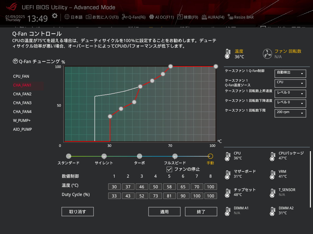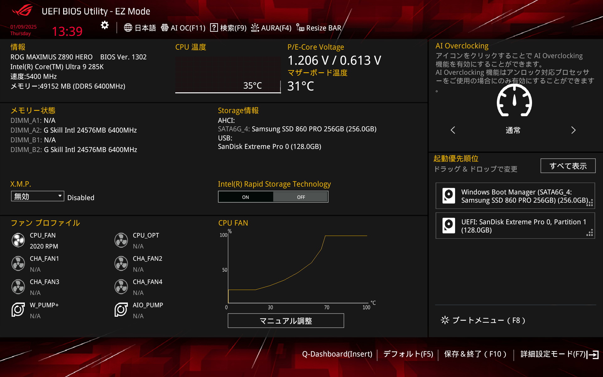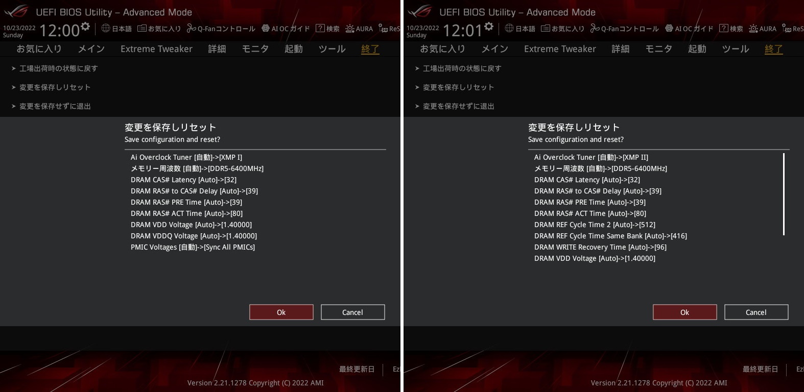 ただメモリとの相性なのか左右スロットの入れ替えでPOST出来ないことがありました。OCプロファイルを適用してPOSTエラーになる場合は、左右スロットのメモリモジュール入れ替えを試してみてください。