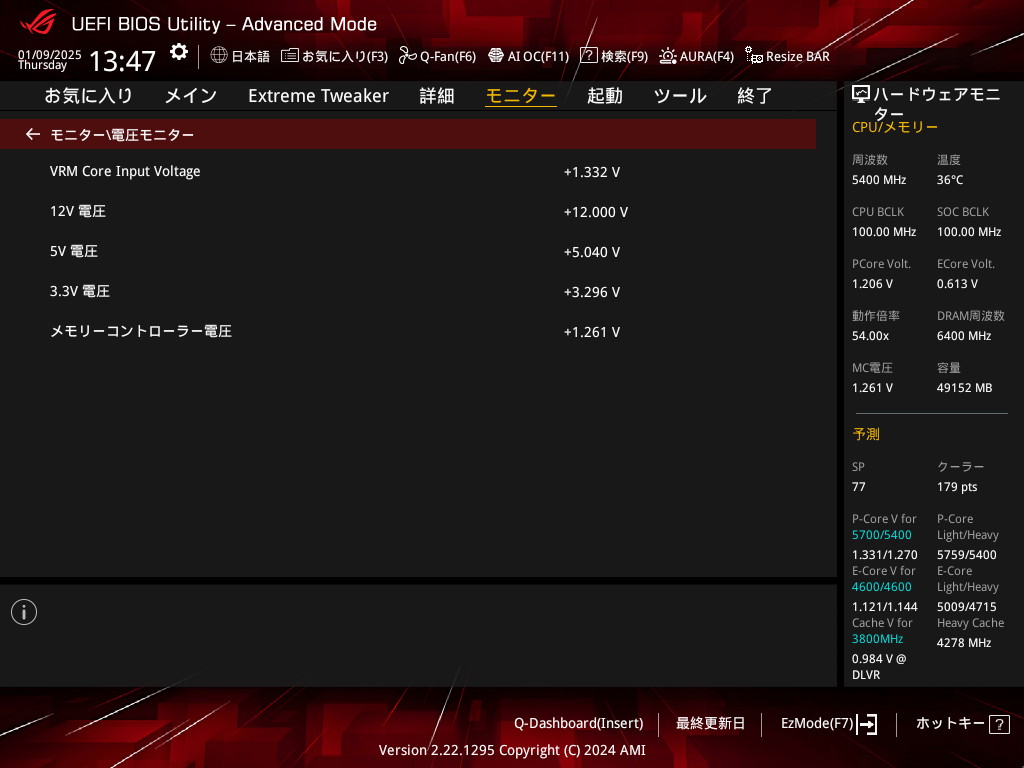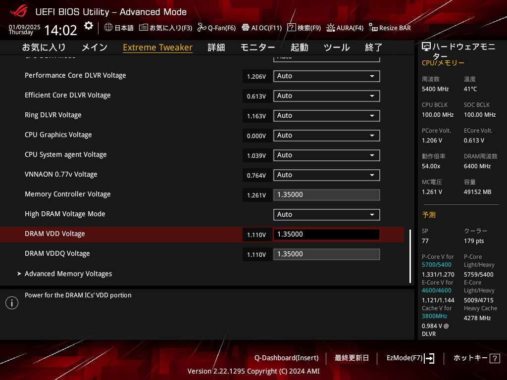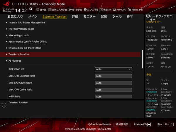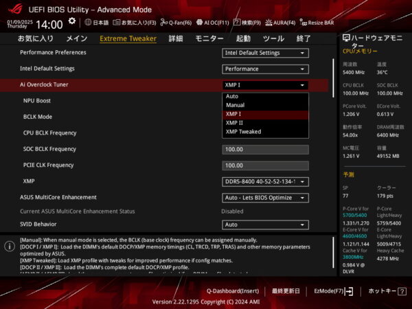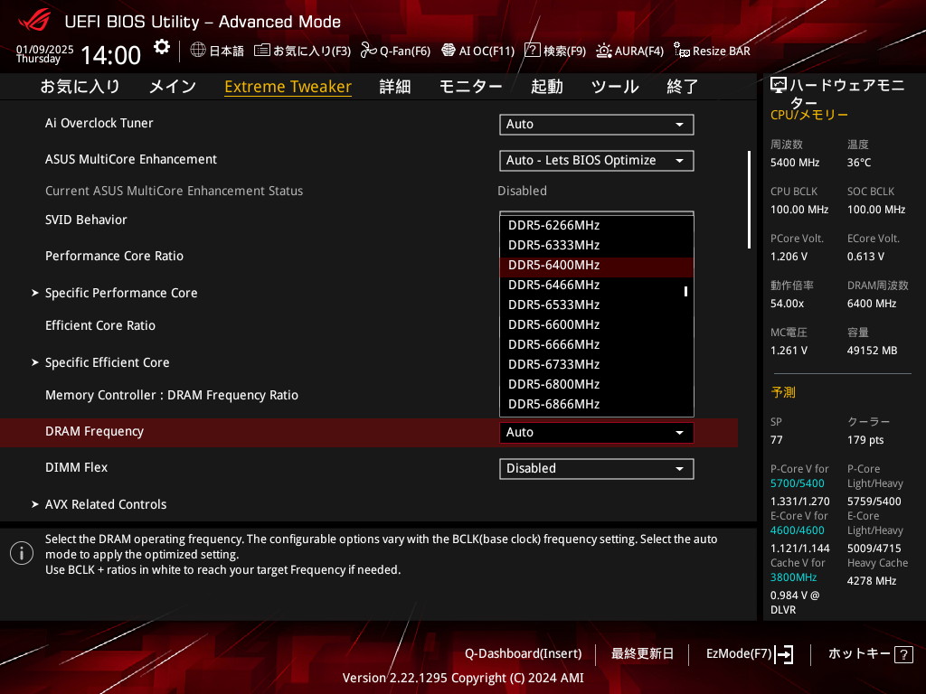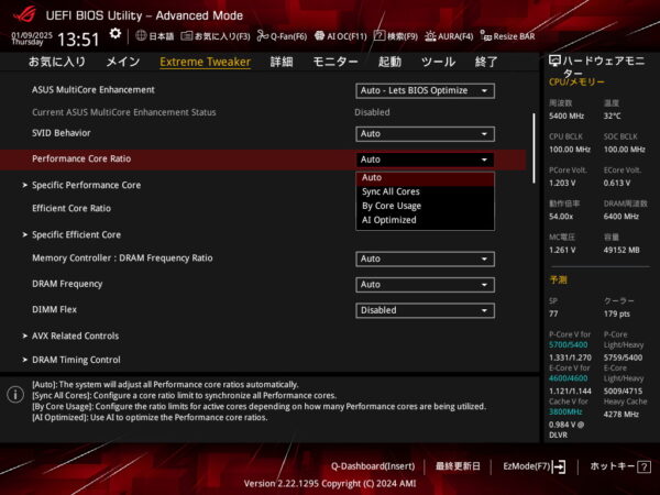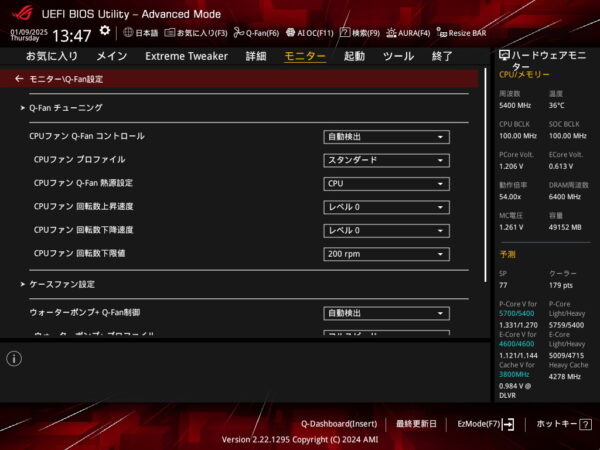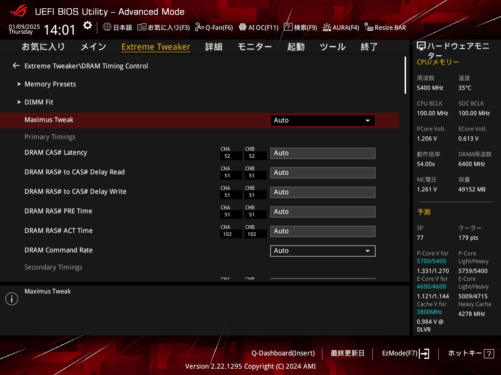 メモリOC設定については検証機材メモリ「Crucial DDR5 Pro OC 6400MHz(CP2K16G64C38U5B)」に収録されたOCプロファイルを適用し、メモリ周波数 6400MHz、メモリタイミング CL38-40-40-84、メモリ電圧1.350Vです。